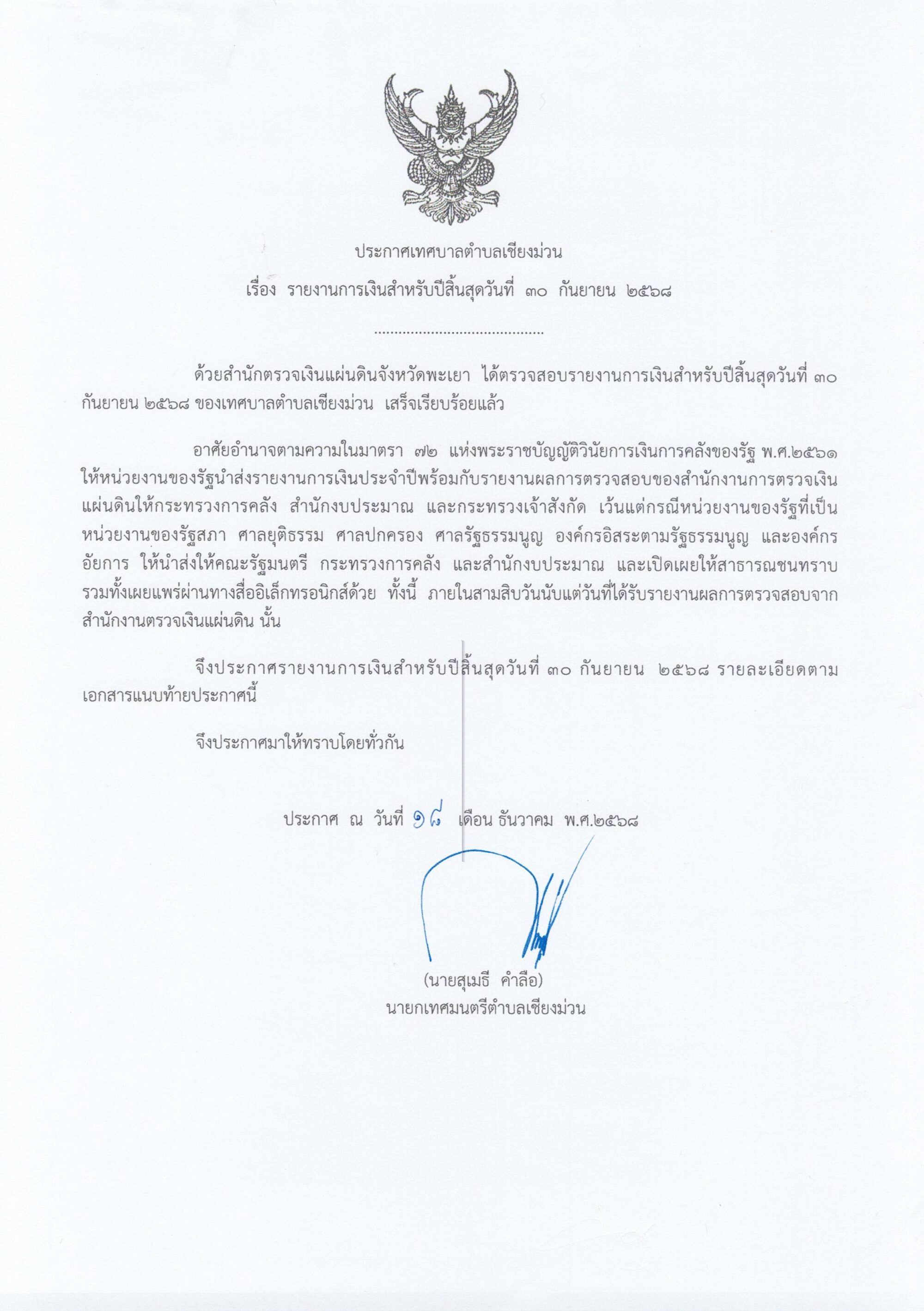 ประกาศเทศบาลตำบลเชียงม่วน เรื่อง รายงานการเงินสำหรับปีสิ้นสุดวันที่ 30 กันยายน 2568by supawit techa-ounin ข่าวสารและประกาศเทศบาล, ข่าวเทศบาลตำบลเชียงม่วน, ประกาศเทศบาลon Posted on 18 ธันวาคม 202518 ธันวาคม 2025 ประกาศเทศบาลตำบลเชียงม่วน เรื่อง รายงานการเงินสำหรับปีสิ้นสุดวันที่ 30 กันยายน 2568 Scan2568-12-18_092413ดาวน์โหลด Related Posts:ประกาศผู้ชนะการเสนอราคาปีงบประมาณ 2568ประกาศผู้ชนะการเสนอราคาปีงบประมาณ 2567แบบสรุปผลการดำเนินการจัดซื้อจัดจ้าง เดือน กันยายน…สรุปผลการจัดซื้อจัดจ้างหรือการจัดหาพัสดุรายเดือนประชุมสภาเทศบาลตำบลเชียงม่วน สมัยประชุมสามัญ สมัยที่…รายงานการเงิน