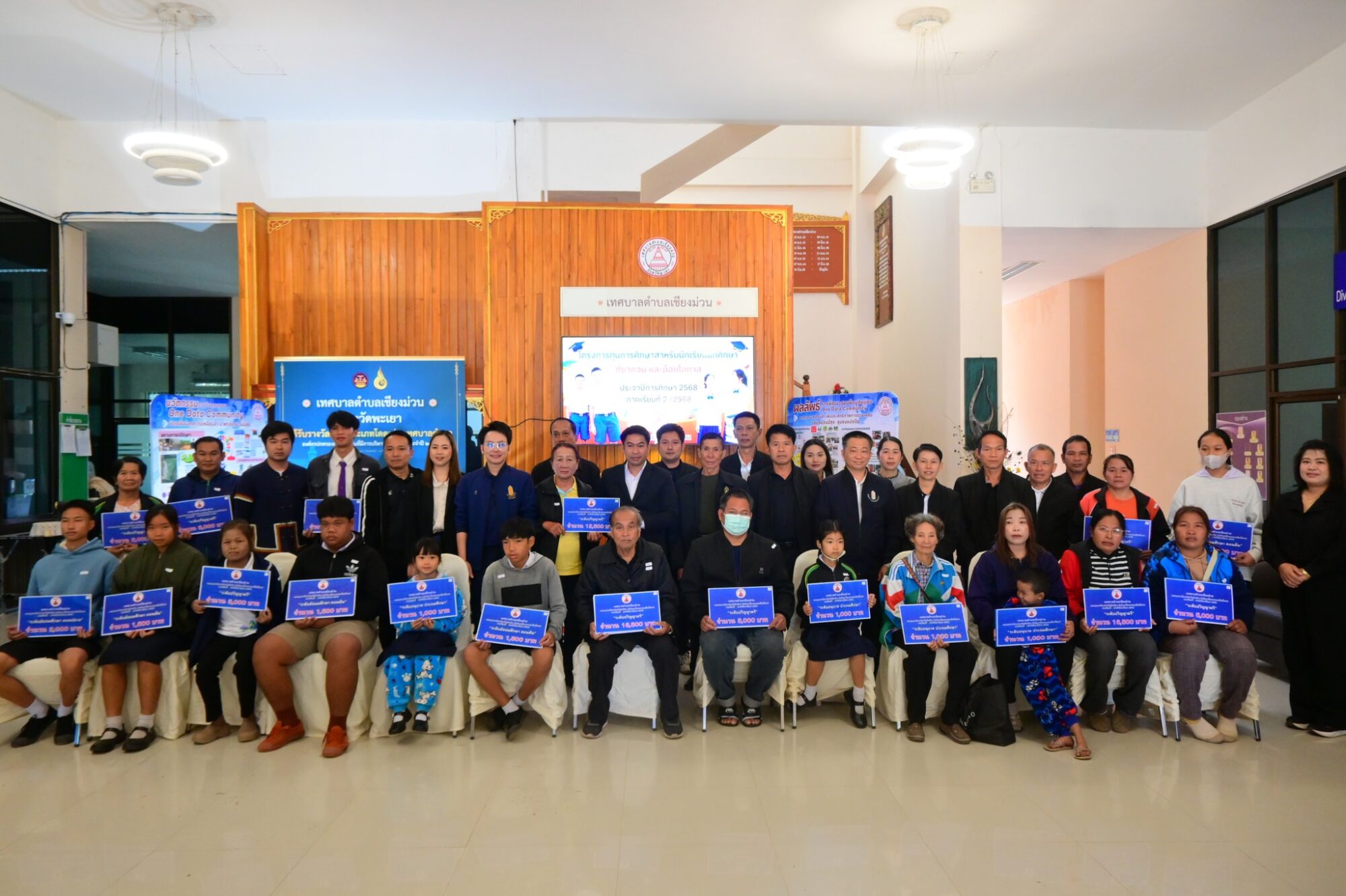 วันที่ 12 มกราคม 2569 เวลา 09.00 น. ณ โถงกลาง สำนักงานเทศบาลตำบลเชียงม่วน นายสุเมธี คำลือ นายกเทศมนตรีตำบลเชียงม่วน เป็นประธานในพิธีเปิด “โครงการสนับสนุนทุนการศึกษาสำหรับนักเรียน นักศึกษาที่ยากจนและด้อยโอกาส ประจำปีการศึกษา 2568 (ภาคเรียนที่ 2)” โดยมีคณะผู้บริหาร ปลัดเทศบาล สมาชิกสภาเทศบาล และหัวหน้าส่วนราชการเข้าร่วมมอบทุนการศึกษาอย่างพร้อมเพรียงกันสำหรับการมอบทุนการศึกษาในครั้งนี้ เป็นไปตามมติเห็นชอบของคณะกรรมการช่วยเหลือประชาชนเทศบาลตำบลเชียงม่วน เพื่อจัดสรรงบประมาณช่วยเหลือเยาวชนที่มีความประพฤติดีแต่ขาดแคลนทุนทรัพย์ โดยมีผู้ผ่านเกณฑ์คุณสมบัติได้รับทุนการศึกษาจำนวนทั้งสิ้น 20 ราย รวมเป็นเงินงบประมาณทั้งสิ้น 93,500 บาท (เก้าหมื่นสามพันห้าร้อยบาทถ้วน) โดยแบ่งตามระดับการศึกษาดังนี้: